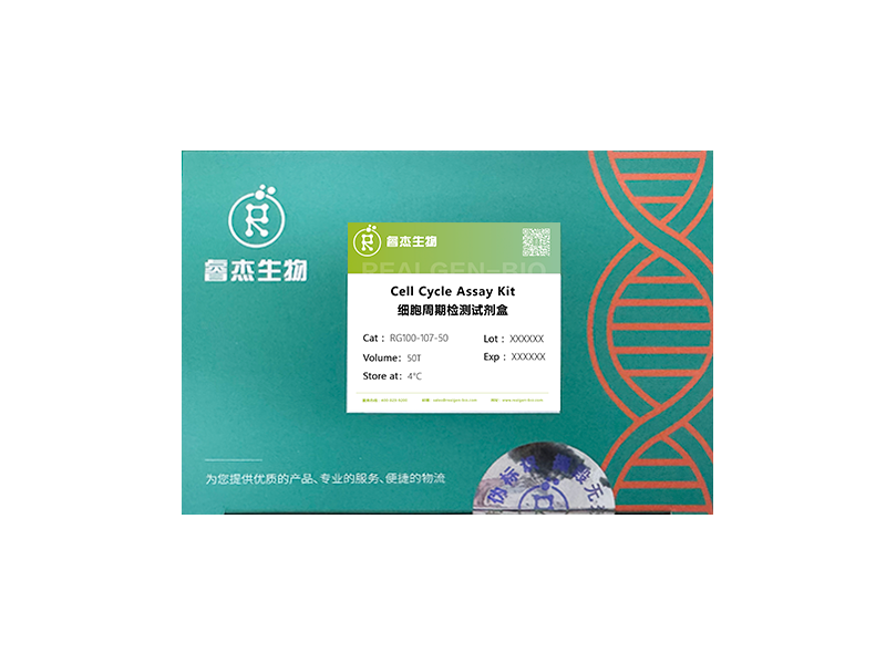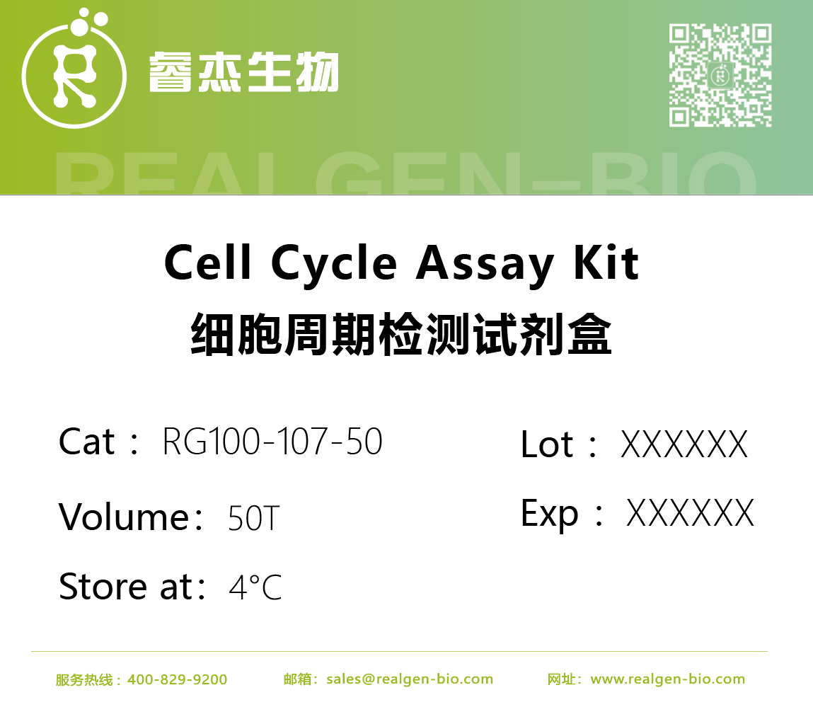 Cell Cycle Assay Kit试剂盒,可快速完成细胞周期的分析,操作简便。本产品使用碘化丙啶(PI)作为DNA荧光染料,碘化丙啶和双链DNA结合后可以产生荧光,并且荧光强度和双链DNA的含量成正比。通过流式细胞术得到细胞周期中G0/G1,G2和S期细胞的比例。
