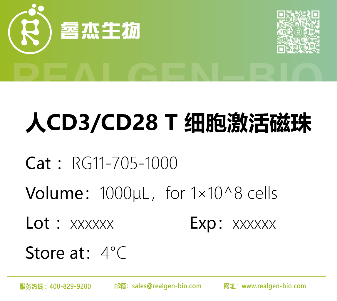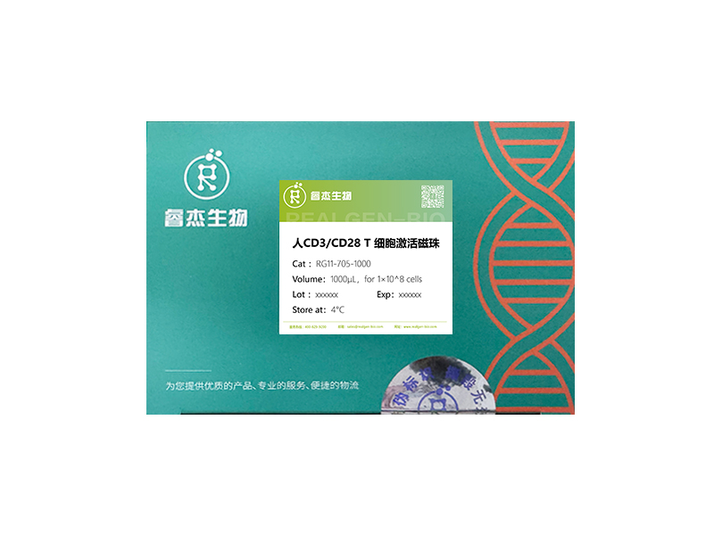 人 CD3/CD28 T 细胞激活磁珠可以简单快捷的活化及扩增 T 细胞,无需饲养层细胞(抗原递呈细胞)或抗原。磁珠为直径 5 µm 的惰性超顺磁珠,大小与抗原呈递细胞相似,同时共价偶联抗 CD3 和抗 CD28 抗体。细胞培养过程中可使用重组人 IL-2 刺激 T 细胞群扩增。活化或扩增后,磁珠可以通过磁力架轻松去除。