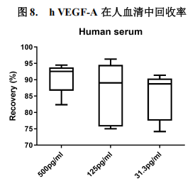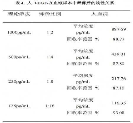 | 稀释平行性 | 不同浓度人VEGF-A的血清样品以4个连续梯度的2倍稀释(1:2-1:16),每个重复4次,评估线性关系 |