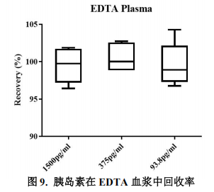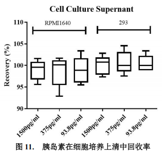 | 回收率 | 人血清中平均回收率:93.5~103.6% 人血浆(EDTA)中平均回收率:96.4~104.3% 人血浆(柠檬酸)中平均回收率:95.7~105.8% 细胞培养上清中平均回收率:92.9~104.6% |